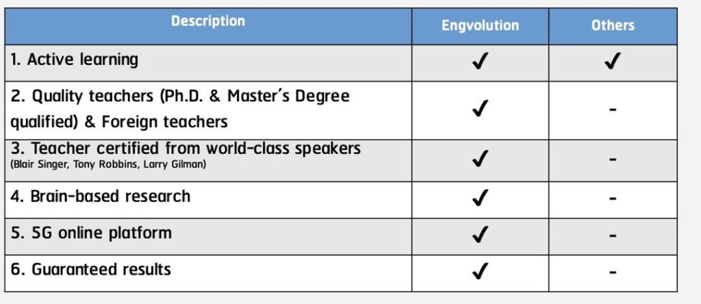 2. พัฒนานวัตกรรมการเรียน การสอนภาษาอังกฤษ ที่เป็นเอกลักษณ์ของ Engvolution (Active Learning & Brain-Based Techniques) โดยเน้นผลลัพท์เป็นสําคัญ